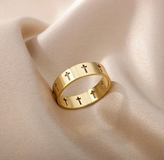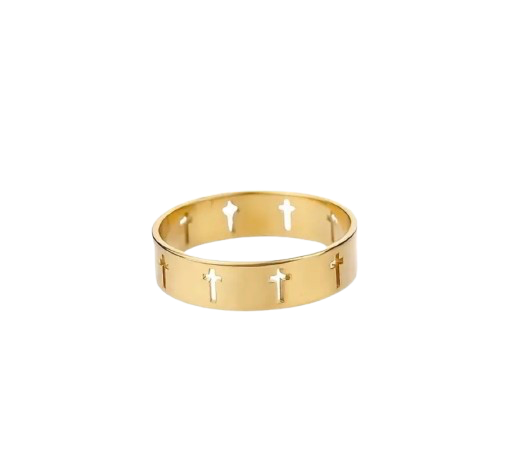 Embrace your faith and style with this stunning Circle of Life Cross Band Ring that compliments any outfit effortlessly. • Gold • 18 karat gold plated • Stainless steel • Rounded cigar band ring • Made...