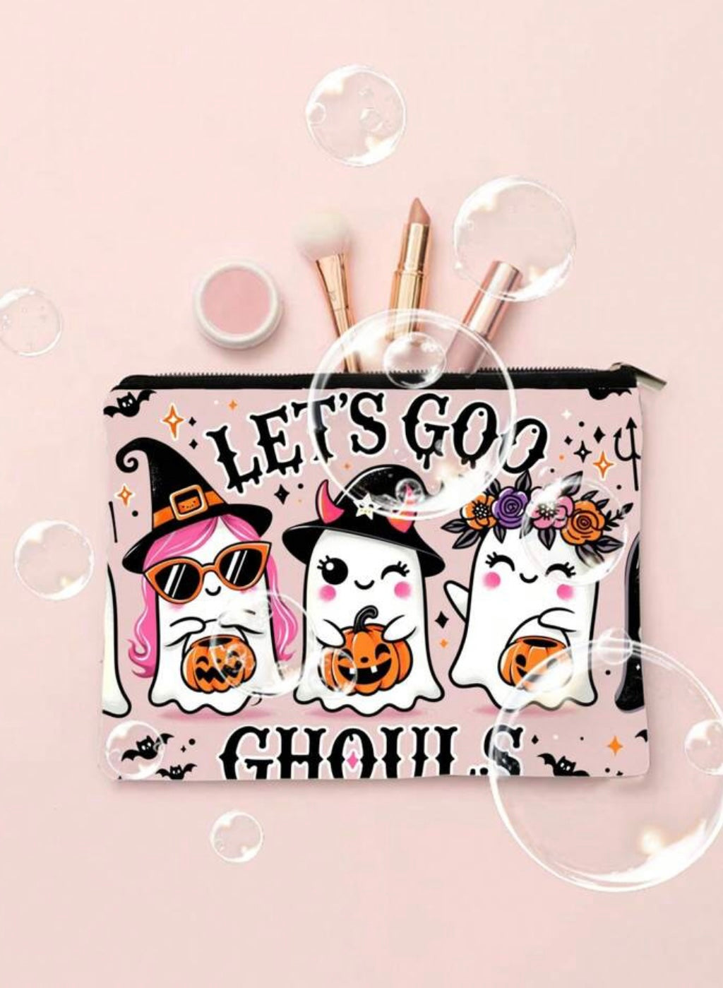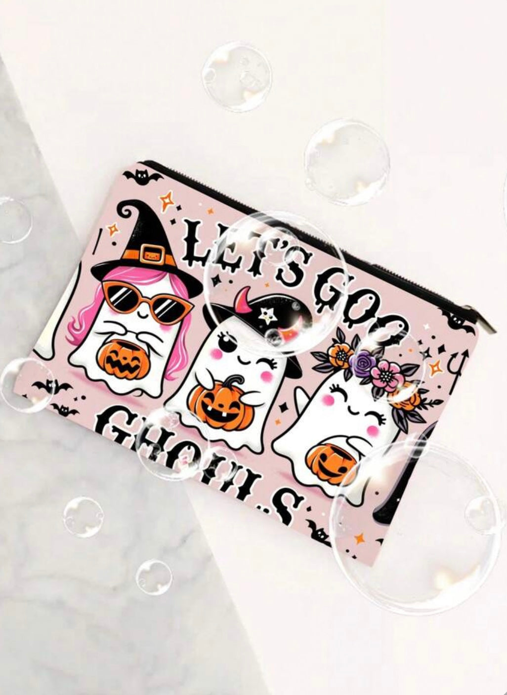 Let’s go ghouls cosmetic bag in pink and black holiday tones. This bag is spacious enough to hold all your makeup and etc. Can also be used as a purse/wallet for carrying your cash, cards, and phone while you’re out running errands. Let’s Go Ghouls Makeup Pouch —— perfect for on-go!